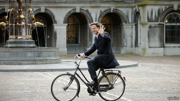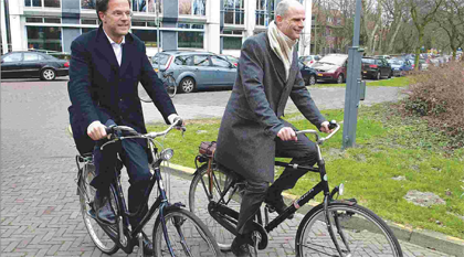 Primeiro-ministro (esquerda) e o líder parlamentar da Holanda, chegam à residência oficial de bicicleta.