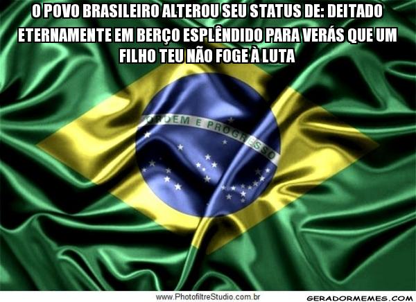 Estaria o poeta profetizando que o Brasil teria no futuro uma casta de privilegiados aproveitadores do dinheiro público que, refestelados no “berço esplêndido” da impunidade, estaria puxando para trás a Nação que trabalha e que produz…? É reconfortante ver, porém, que em paralelo a esse bando que só pensa em extorquir a Nação e fortalecer o próprio patrimônio, sem qualquer limite de moralidade, existe um povo e uma juventude que se manifesta, democraticamente, em um “brado retumbante” que ecoa em todo o Brasil: “Verás que um filho teu não foge à luta”!