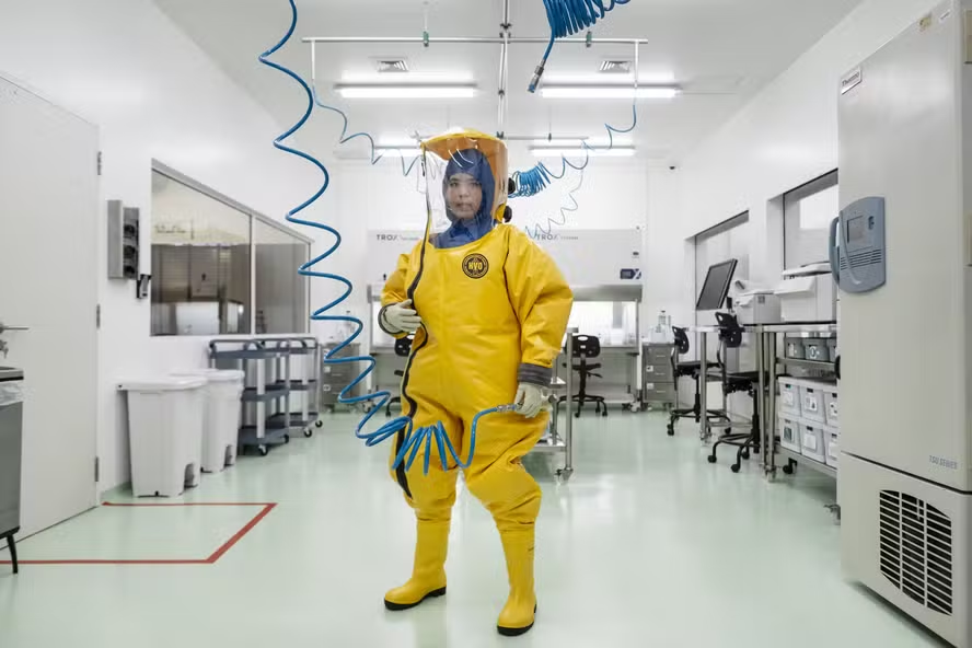 Nessas instalações de biossegurança máxima, cientistas precisam de trajes isolados pressurizados com oxigênio pessoal ou usar as chamadas “caixa de luva”: cubos de vidro lacrados, com luvas conectadas a aberturas para as mãos.