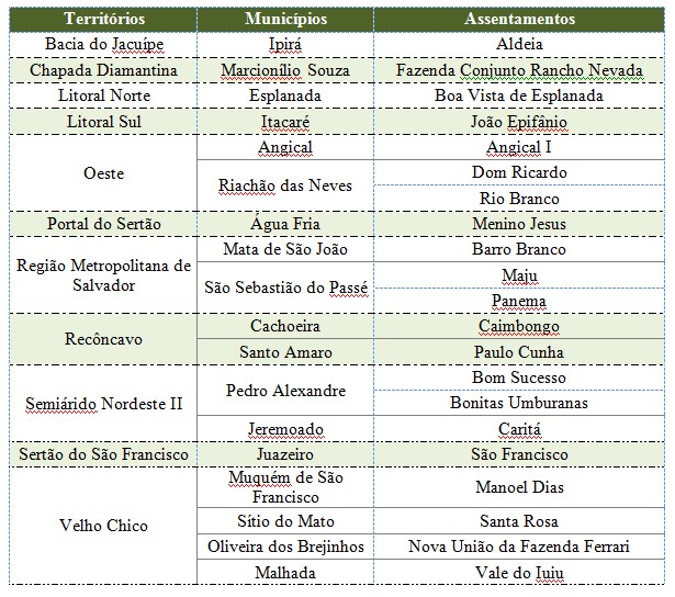 Há mais agricultores convocados no Recôncavo. São 71 assentados do projeto Caimbongo, que fica no município de Cachoeira, e na área Paulo Cunha, localizada em Santo Amaro. Já o assentamento Menino Jesus, situado no município de Água Fria, no território Portal do Sertão tem 51 assentados incluídos no edital.