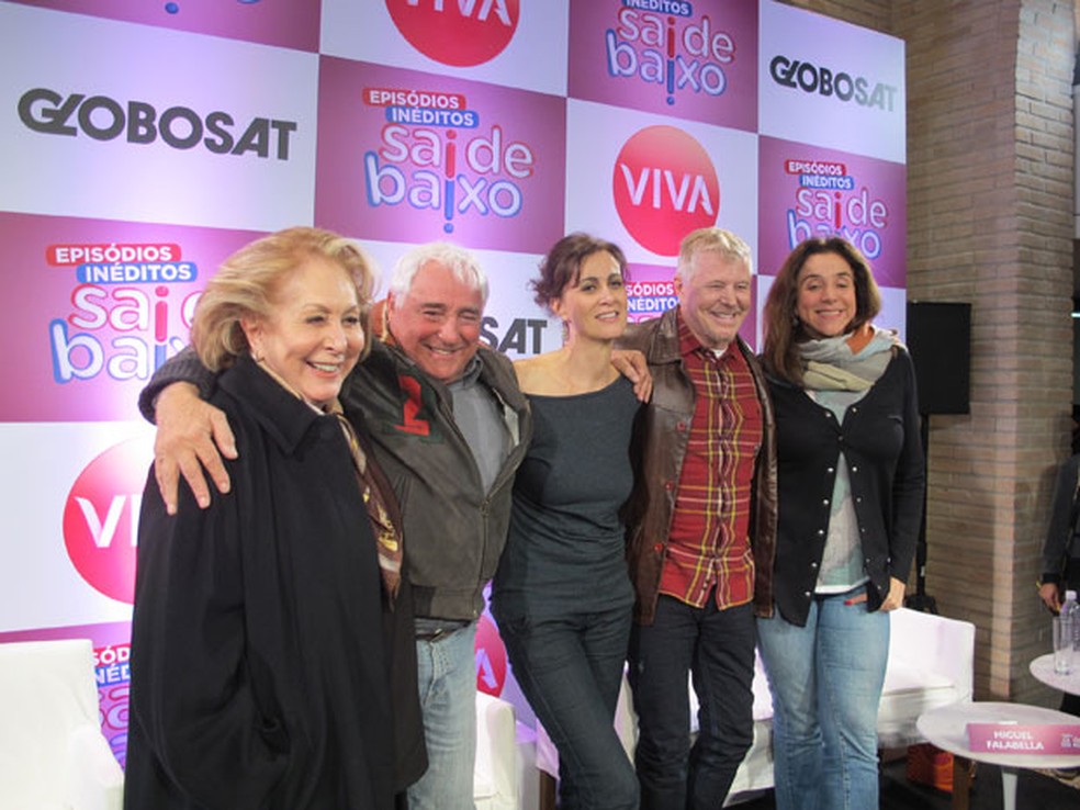 Os atores Aracy Balabanian, Luis Gustavo, Marcia Cabrita, Miguel Falabella e Marisa Orth na entrevista coletiva de lançamento dos quatro novos episódios do humorístico ‘Sai de baixo’ – Foto: Cauê Muraro/G1