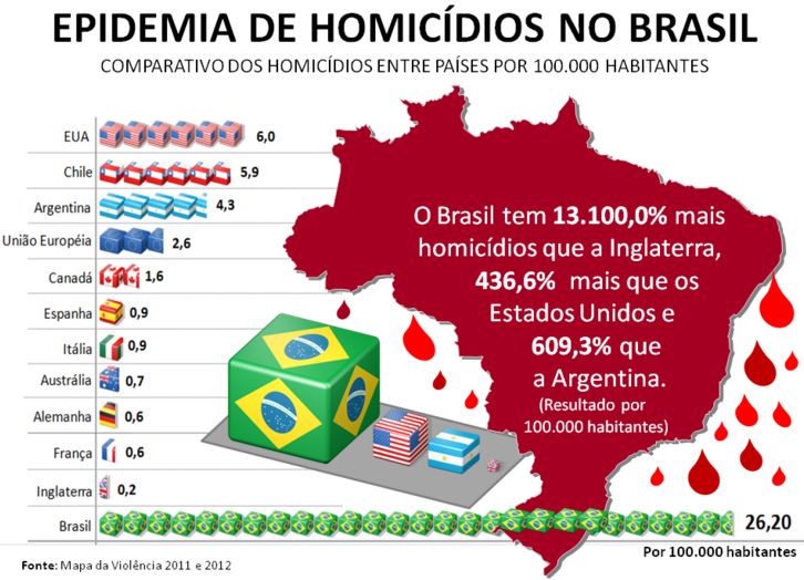 Foram 278.839 ocorrências de homicídio doloso, latrocínio, lesão corporal seguida de morte e mortes decorrentes de intervenção policial no Brasil, de janeiro de 2011 a dezembro de 2015, frente a 256.124 mortes violentas na Síria, entre março de 2011 a dezembro de 2015, de acordo com o Observatório de Direitos Humanos da Síria.